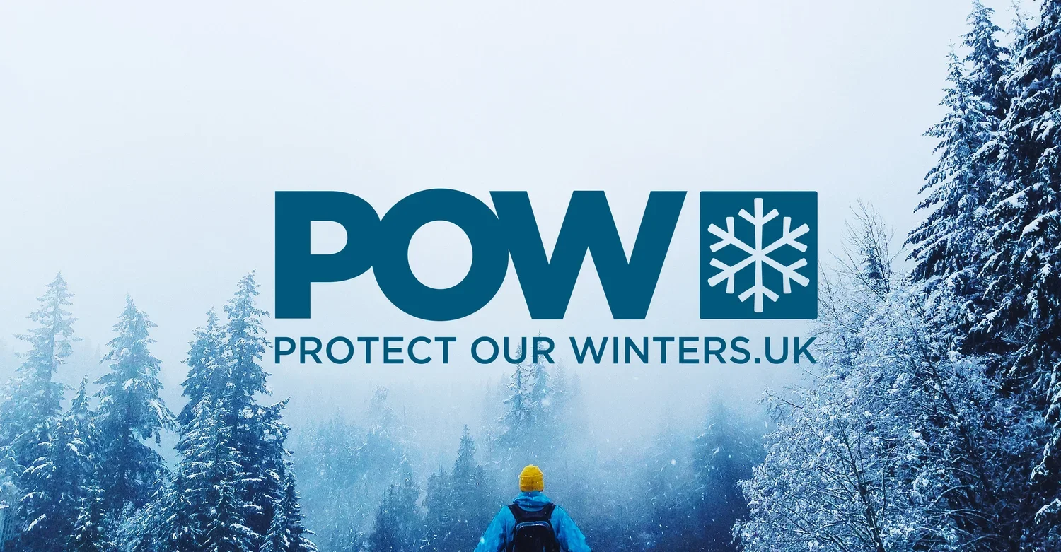 A person dressed in winter outdoor clothing with a yellow hat and backpack walking through a snow-covered forest with tall trees, overlaid with a slogan 'POW' and a snowflake icon, promoting winter protection.